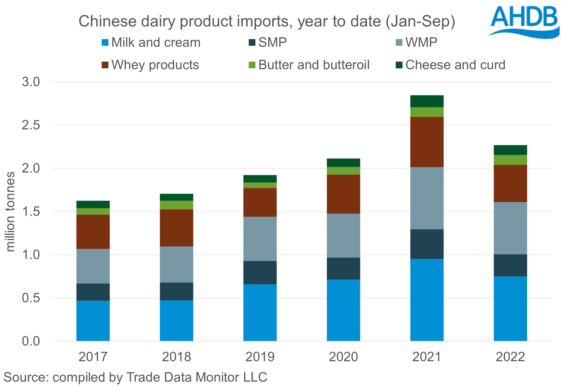 Domestic milk production is reported to have increased in 2022 due to a larger herd and government drive to increase self-sufficiency. This increased production teamed with the impact of continued covid lockdowns has meant less fresh product has been required. This has led to milk and cream seeing the largest year on year decline in volume terms, with over 200,000 tonnes less product imported.