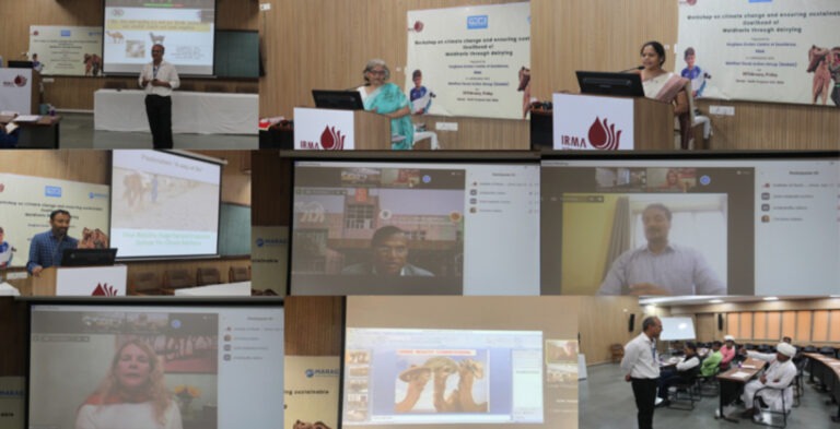 Verghese Kurien Centre of Excellence (VKCoE) organized a workshop on ‘Climate change and ensuring sustainable livelihood of Maldharis through dairying’ in IRMA on 24 February 2024 in collaboration with Maldhari Rural Action Group (MARAG). The workshop began with an inaugural address by Dr. JB Prajapati, Chairperson, VKCoE. He emphasized that the session be more interactive and that one has a lot to learn from the Maldhari attendees. The guests on the dais were felicitated with a rose and a handkerchief.