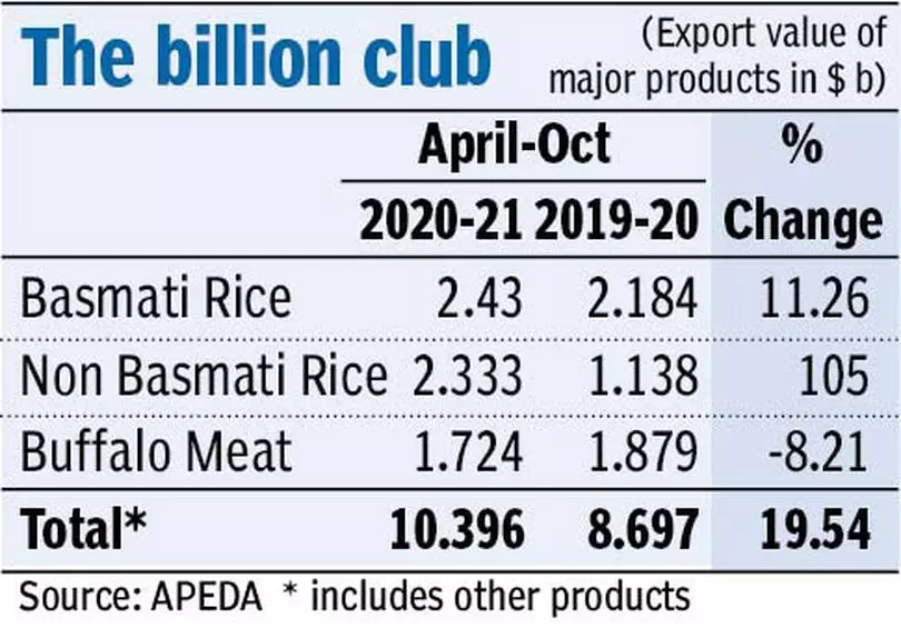 Fuelled by the rising demand for Indian rice, exports of farm produce monitored by the Agricultural and Processed Food Products Export Development Authority (Apeda) crossed the $10 billion mark during the April-October period this year, registering almost a 20 per cent growth over same period last year.While basmati rice continues to be the largest exported farm produce, the robust demand for the cereals has pushed up the shipment of non-basmati rice.